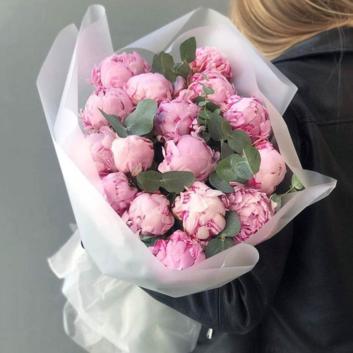 Букет из 15 розовых пионов с эвкалиптом