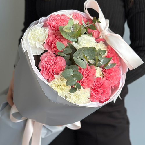 Букет из 15 белых и розовых диантусов с эвкалиптом — это изысканное сочетание нежности и свежести.