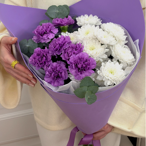 Букет в сиреневых тонах «Без повода» — это изящное сочетание нежных оттенков, которое подарит радость без особого случая. Мягкие сиреневые тона создают атмосферу умиротворения и лёгкости, а продуманная композиция из свежих цветов выглядит стильно и современно.