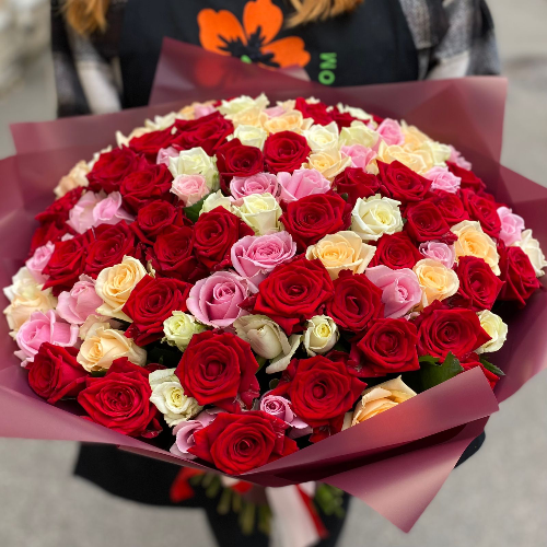 Букет из 101 розы разных оттенков является одним из самых желанных среди женщин. Это возможность проявить свои высокие чувства и порадовать близкого человека шикарным подарком. В букет входят розы нескольких сортов. Это персиковые «Пич Аваланш», красные «Ред Наоми» и розовые «Кэнди Алаванш». Каждый бутон отличается правильной формой и длительным периодом стойкости при правильном уходе.