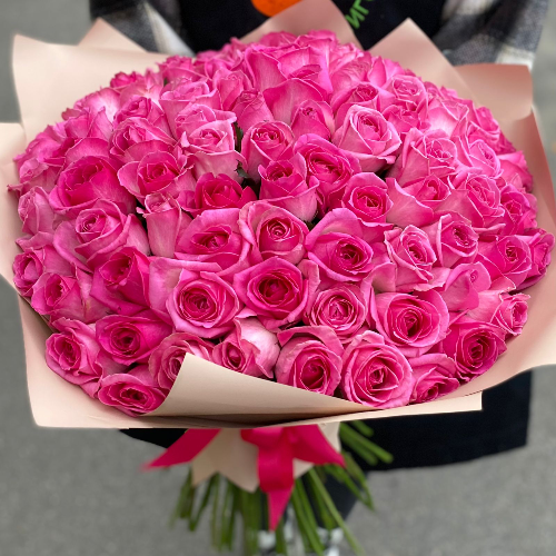 Букет из 101 розовой розы символизирует любовь, романтику и доброту. Заказав такой букет с доставкой, Вы как бы отправляете все эти чувства Вашему близкому человеку. Вы также можете указать текст для записки, которую курьер передаст вместе с букетом. Получателю будет вдвойне приятно, помимо шикарного букета, получить теплые пожелания!