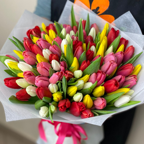 101 тюльпан микс – впечатляющий букет, источающий завораживающий аромат. В нем сочетается нежность и роскошь. Каждый цветок олицетворяет светлую чистоту. Такие композиции можно дарить не только на 8 марта, но и на День Рождение, в день свадьбы, на юбилей, своей любимой. Вместо слов прощения тоже подойдет шикарный букет, который мы готовы доставить вашему близкому человеку в указанное место и к нужному времени.