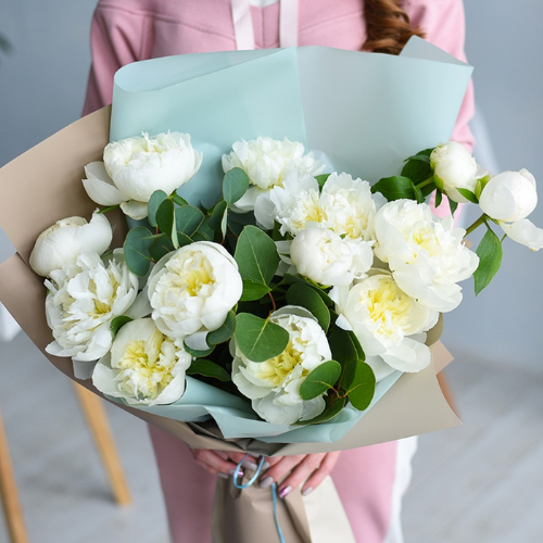 Удивительно нежные, белые пионы в лаконичном обрамлении – символ чувственности и красоты. Они покоряют своим тончайшим ароматом, пленяют воздушностью. Композиция с ажурными лепестками подходит для романтичных натур, она сделает свидание незабываемым, подойдет для любого торжества. Идеальное дополнение, чтобы сделать долгожданное предложение руки и сердца.