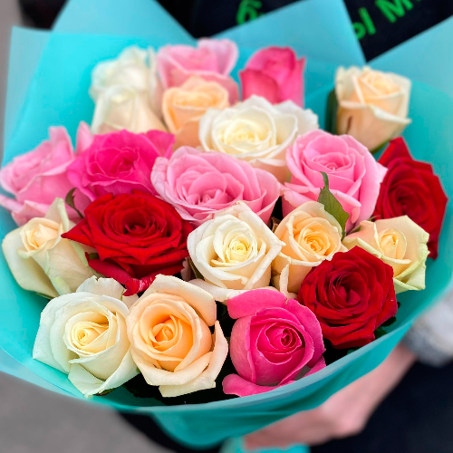 Красивый букет из 21 розы микс: персикового, красного и розового цвета. Мы доставим этот букет по адресу, который Вы укажете в заказе, для Вашего близкого человека.