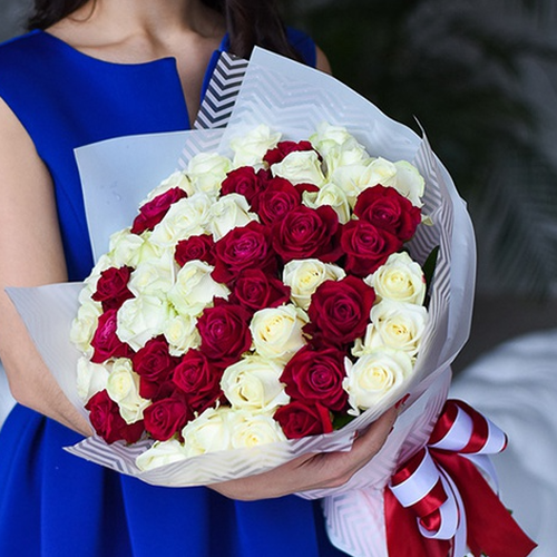 Букет из 51 белой и красной розы, красиво собранных вместе! Приятные и нежные оттенки роз воплощают настоящее чудо созданное нашими флористами.