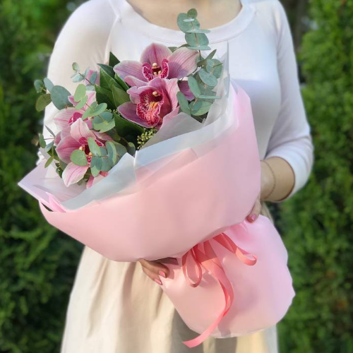 Букет из 5 розовых орхидей - классический пример букета - комплимента, который принято дарить в качестве знака внимания. Такой букет можно дополнить открыткой с Вашим текстом и пожеланиями. Это можно сделать при оформлении заказа.