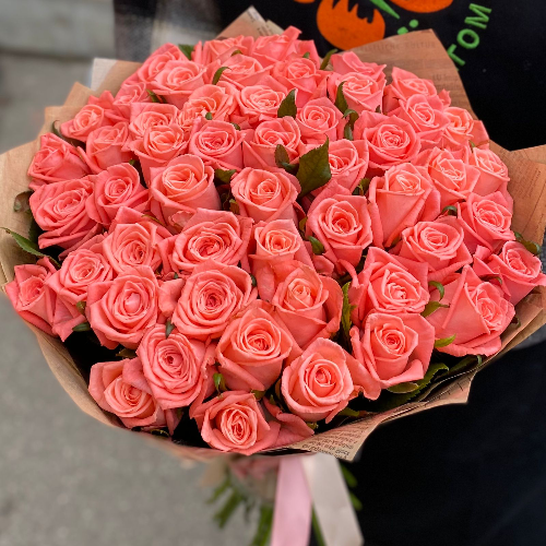 Букет из 51 коралловой розы. «Анна Карина» – это сорт нежных коралловых роз, которые произведут большое впечатление на женщину. Пышные бутоны как будто сотканы из тончайшего шёлка или атласа. Они создают вокруг себя ауру лёгкого, нежного аромата. В сочетании с простой, но элегантной упаковкой и атласной ленточкой букет смотрится великолепно. Его можно преподнести своей девушке, маме или сестре. Любая представительница прекрасного пола от такого подарка почувствует себя любимой и желанной.