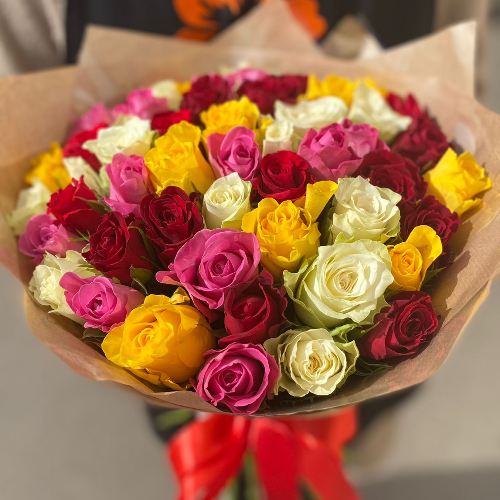 Букет из 51 кенийской розы в красивой упаковке и с ленточкой. В составе букета представлены розы различных сортов из солнечной Кении, эти цветы также отличаются хорошей стойкостью.