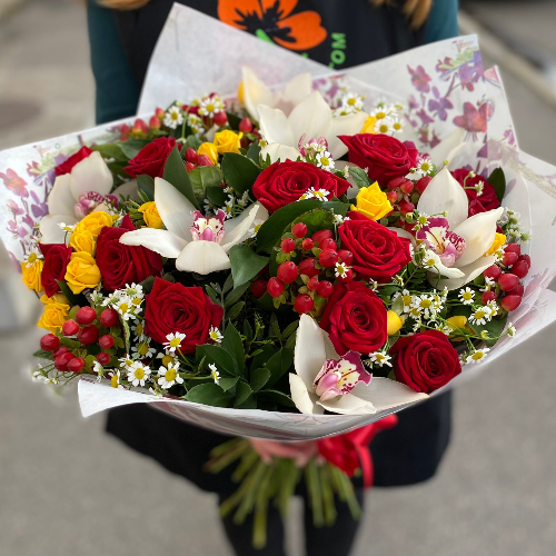 Яркое, теплое и незабываемое поздравление с Днем рождения или юбилеем поможет сделать этот букет. В нем удачно сочетаются красные и желтые розы, белые жемчужины орхидей, задорные ягодки хиперикума и экзотическая зелень. Такой экзотический букет – это целая палитра впечатлений и приятных эмоций!