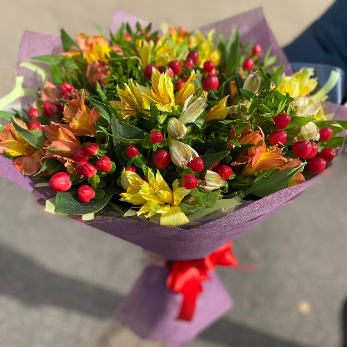 Букет из 19 разноцветных альстромерий и хиперикума, в красивой упаковке.