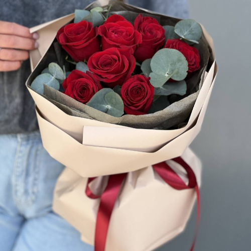 Букет из 7 красных роз Premium с эвкалиптом - это не просто цветы, это настоящее произведение искусства, которое подарит Вам и Вашим близким незабываемые эмоции. Не упустите возможность порадовать своих близких прекрасным и стильным букетом!