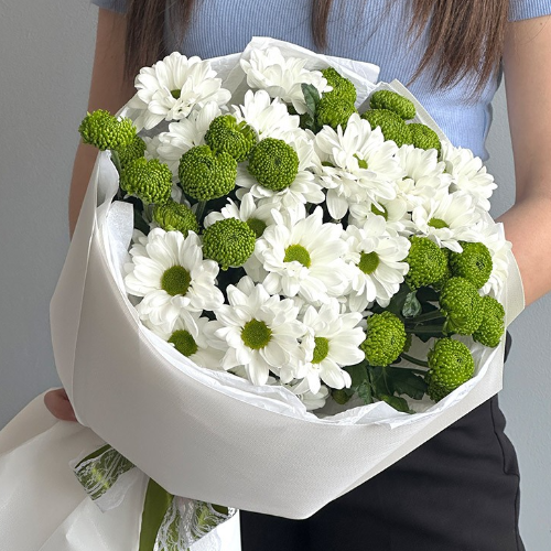 Букет из белой и зелёной кустовой хризантемы — это гармоничное сочетание классики и природы.