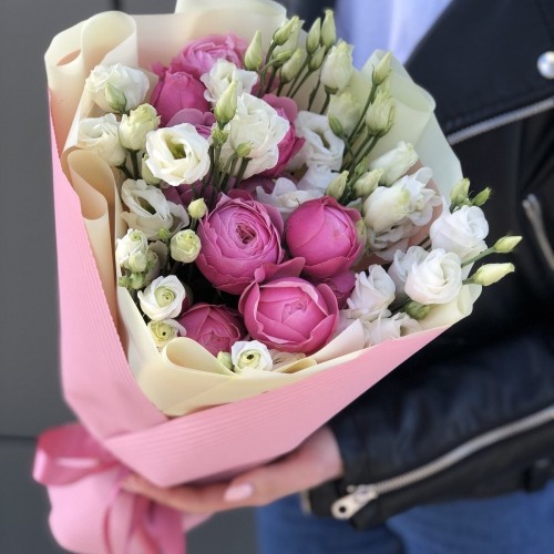 Подарите незабываемые эмоции с нашим изысканным букетом! Нежные розовые пионовидные розы в сочетании с белоснежными эустомами создают утонченную композицию, которая станет идеальным подарком для любого случая.