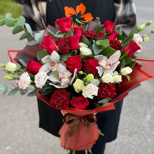 Название букета произошло от редкого сорта роз "Майя Ред", которые являются основным цветком в букете. Но не будем забывать и про красивое дополнение в виде белых орхидей, потрясающее сочетание всей композиции. Этот букет безупречен как вкус и аромат самого вкусного Капучино. Будьте уверены, близкий человек по достоинству оценит такой букет.