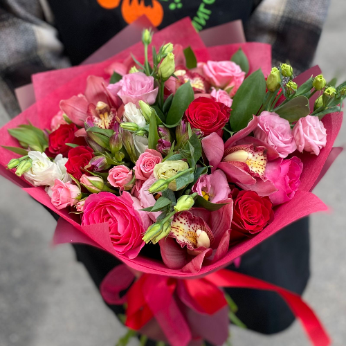 Яркий и праздничный, словно карнавал этот букет поднимет настроение и подарит беззаботное веселье. Сочетание красного и зеленого цветов, воплощенных в разных видах цветов, вызывает подъем эмоций с первых минут! Отличный вариант для Дней рождения, который поддержит радостное настроение торжества.