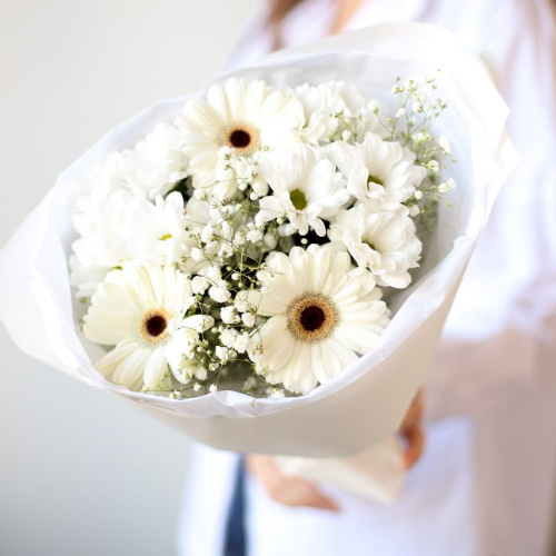 Композиция «Лорьян» – нежный и красивый букет для особого случая, признания в симпатии или благодарности близкому человеку. Здесь чувственные лепестки хризантем нежно переплетаются с красивейшим блеском белых гербер, дополняются белоснежными вкраплениями воздушной гипсофиллы.