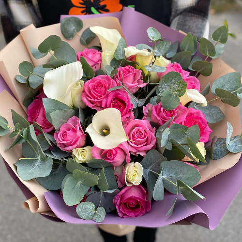 Свежий букет "Монте Кристо" из роз различных оттенков в окружении эвкалипта - удивительный шедевр флористов. Если классические букеты из роз немного надоели, и хочется что-то новенькое, но Вы очень любите этот цветок - такое флористическое решение отлично подойдет.