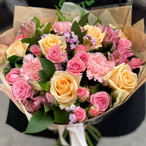 Яркий цветочный букет «Мулен Руж» станет прекрасным подарком любимой женщине. Букет составлен из отборных персиковых роз, которые растопят любое сердце и принесут океан положительных эмоций. Вместе с розами в букете соседствуют альстромерии и утонченные кустовые розы. Такой красивый букет создает праздничное настроение в любых обстоятельствах.