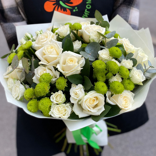 Стильный букет в сдержанной, но в тоже время роскошной цветовой гамме, сочетающий белый и зеленый цвета. Благодаря этому, букет становится универсальным цветочным подарком для самых разных людей и по любому поводу. Благородные розы подчеркнуты объемной палитрой зелени. Такой букет подчеркнет Ваш безупречный вкус!