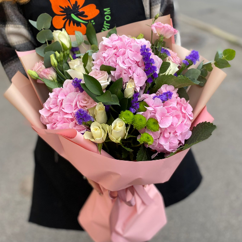 Букет "Романс" - яркий летний букет, пропитанный свежестью и воздушностью шикарной гортензии. В окружении эвкалипта и других цветов она действительно неповторима и уникальна. Получить такой букет будет очень приятно по любому поводу и без него.