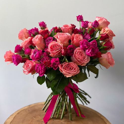 Огненный рассвет — это изысканный букет из кустовых и одноголовых роз, который станет настоящим украшением любого события. Нежные розовые и насыщенные красные оттенки создают эффектный контраст, символизируя страсть и нежность. Каждый бутон словно воплощает рассвет нового дня, полный энергии и вдохновения.