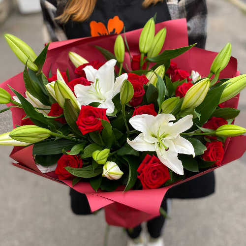 Шикарный букет, сочетающий аромат белых лилий и пылающую страсть красных роз. Поистине, символ, действительно сильной любви и крепких чувств. Букет из роз и лилий прекрасный подарок по любому поводу и торжеству, главное дарить его по настоящему близкому человеку!