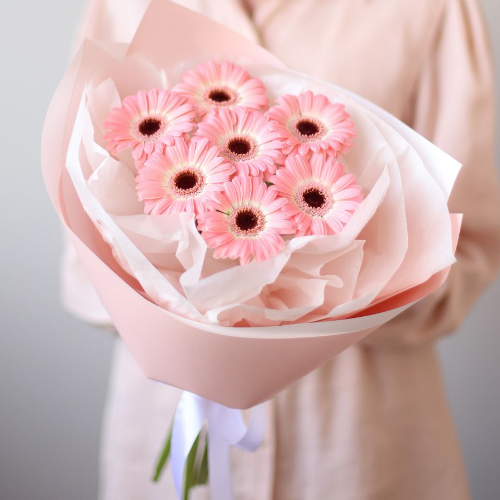 Без сомнения каждый букет является посланием и несет в себе определенную загадку. Сочетание розовых хризантем и и гербер - это символ заботы и добрых намерений.