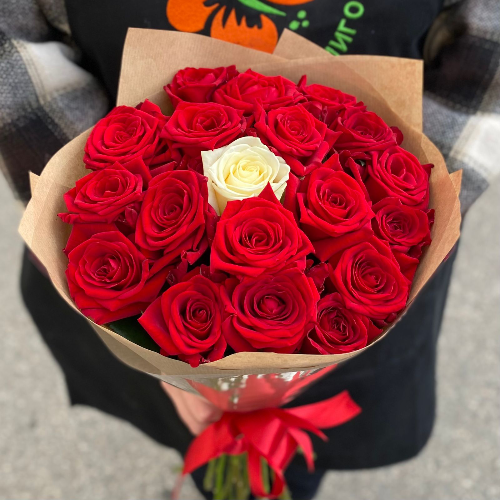 Как поднять настроение любимым и близким людям, если Вас разделяют километры и часы пути? Букет цветов с доставкой будет отличным решением! А если букет составлен  в такой креативной композиции из ярких красных роз, красиво и задорно сочетающихся с одной белой розой – это радость вдвойне.