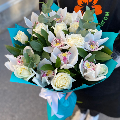 Легкость, и одновременно изысканность букета поражает с первых минут. Белые, воздушные орхидеи в сочетании с розами и свежей зеленью воплощают образ солнечного летнего утра. Букет замечательно подойдет как для ранних сюрпризов, так и для вечерних признаний.