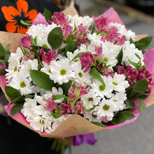 Сочетание белых хризантем и альстромерий создает пышную композицию, напоминающую свежие цветы на белом снегу. Такой букет будет классным сюрпризом в солнечное январское утро.