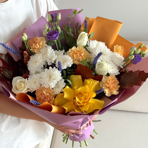 Цветы для учителя: букет с листьями дуба. Цветы для учителя — это изысканный букет, созданный с любовью и уважением. В его композиции гармонично сочетаются нежные белые хризантемы, яркие желтые розы, изысканные фиолетовые эустомы и декоративные листья дуба, символизирующие мудрость и силу.