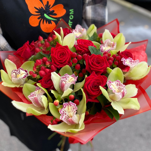 Яркий букет из красных роз и открытых солнцу орхидеи – словно приглашение на задорный танец! Подарите его тем, чью улыбку хотите увидеть – такой радостный букет просто не может ее не вызвать. Идеален как для свиданий, так и для Дней рождения, а еще такая цветочная полька отлично поднимает настроение!