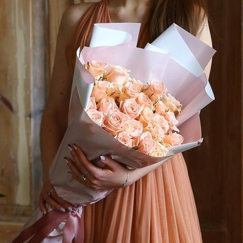 Букет роз «Энгажемент» - это сама нежность, воплощенная в элегантных цветочных бутонах кремово-розового цвета! Еще более хрупкими и трепетными эти розовые розы выглядят на фоне темной глянцевой зелени. Розовые розы – прекрасный подарок романтичным натурам, а еще такой букет без лишних слова расскажет о самых светлых и теплых чувствах. Розы элитного сорта «Энгажемент» надолго сохраняют свежий вид и аромат.