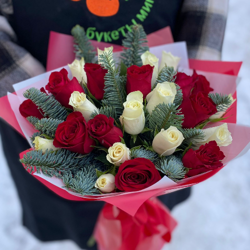 Букет "Снежная королева" пленяет неожиданно смелым сочетанием цветов и веточек голландской ели. В этой композиции флорист продумал каждую деталь, начиная от безупречной формы и заканчивая оттенком и фактурой упаковки. Совершенство красных и белых роз подчеркивает яркая упаковка. Объемная ножка букета перевязана атласной лентой в тон более крупным белым розам. Благодаря характерной расцветке нобилиса создается ощущение, что веточки слегка припорошены снегом.